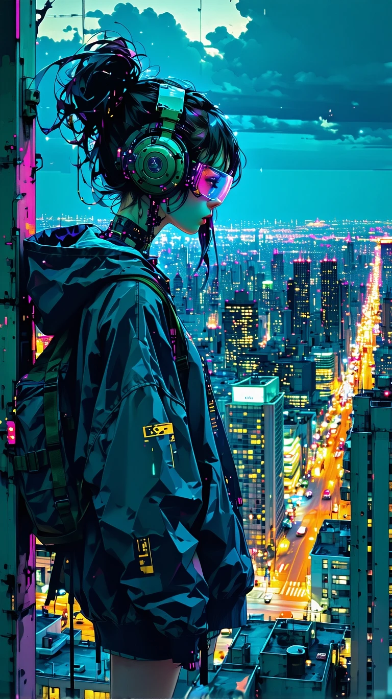 A visual stunning photo of a female cyberpunk looking over tokyo skyline |centered| key visual| intricate| highly detailed| breathtaking beauty| precise lineart| vibrant| comprehensive cinematic| Carne Griffiths| Conrad Roset| Borderlands| neon| sparkle