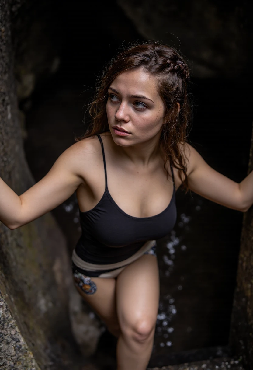 A woman stands at the mouth of the cave, her physique radiating through every detail of her appearance like a work of art that's been carefully crafted by the finest hands. Her single braid brunette hair is intricately woven, framing her face and adding a touch of elegance to the scene. Light blue eyes sparkle with a hint of intensity, like a whispered promise that's been shared with no one. A tank top clings to her body, showcasing her toned physique and adding a touch of sensuality to the scene. Cargo pants hang loose around her midriff, seeming to be made for comfort rather than style like a whispered promise that's been shared with no one. She leans against the rock wall, her muscles rippling beneath her skin as if she's been exerting herself. Sweat beads on her forehead, adding a touch of authenticity and humanity to the scene like a whispered promise that's been shared with no one. Dark and damp surroundings seem to envelop her, adding a sense of mystery and adventure to the moment like a work of art that's been carefully crafted by the finest hands. Bokeh effects blur the background, adding a sense of intimacy and quiet contemplation to the moment like a secret that's been shared with just one person. Every detail of this image feels alive and tangible, like a moment that's been captured at its very best.