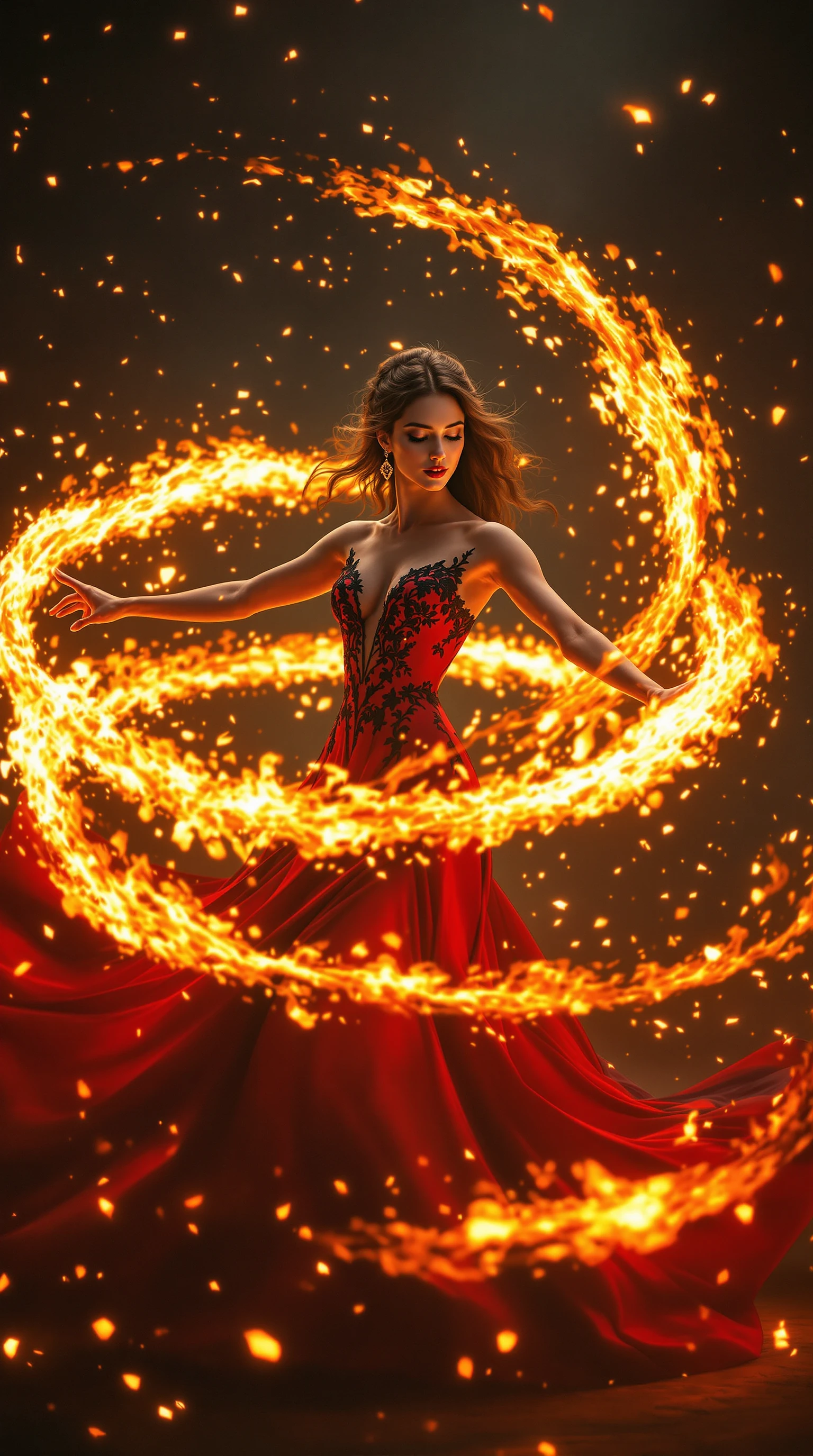 A mesmerizing and dramatic scene of a woman dancing amidst swirling flames, her movements forming a perfect ring of fire around her. She wears an elegant flowing red gown, embroidered with intricate black lace details, which flares dramatically as she spins. Her expression is serene and focused, her posture graceful yet powerful, exuding an aura of strength and passion.
