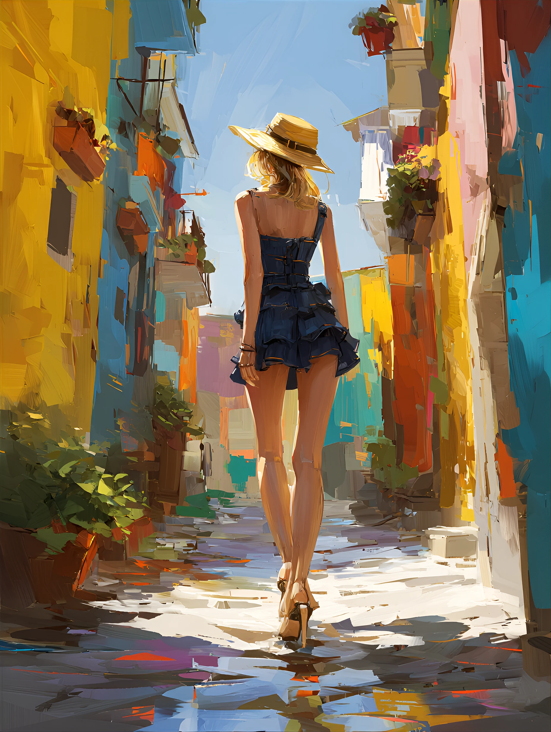 woman with light blonde hair, likely in her 20s or 30s, is depicted walking down a colorful, narrow alleyway. She is of light complexion. She wears a straw hat, a dark-denim, sleeveless jumpsuit with ruffled details on the bottom, and high heels. Her back is to the viewer, displaying a tan. Her posture is confident and graceful. The alleyway walls are painted with vibrant colors, including yellows, blues, oranges, and reds, with visible brushstrokes. Flower pots are positioned along the sides of the alley
