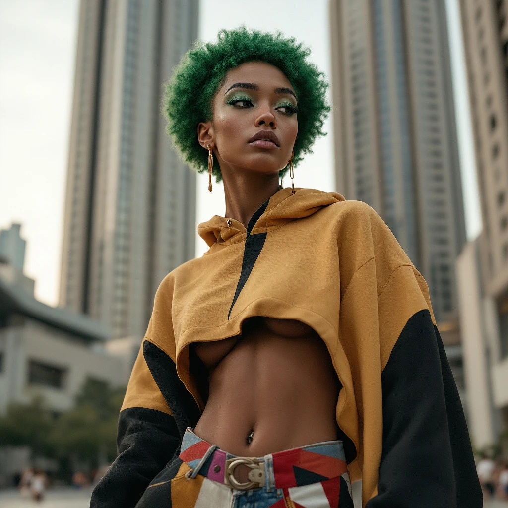 modernist, Constructivist Fashion full body photo of a 24-year-old Anuak-Sinhalese female boho chic beauty with Pensive look with fragmented features expression. She has Medium-tan skin with a hint of olive, evenly bronzed from regular sun exposure. The skin pores and texture are clearly visible and in focus. Her Eyes with scalloped edges, Soft, pale green eyes, framed by long, elegant eyelashes. Her haircut is Geometric afro with precise, angular shaping, haircolor is Revolutionary Green. Her eyebrows are Retro arch shaped, complementing her delicate facial features. Her body is Strong, rounded shoulders that create a powerful silhouette, bigger breast, toned abs. She is dressed with Cropped hoodie with graphic panels, midriff, Slim-fit jeans with geometric color-blocking. She is positioned in Fragmented body rotation inspired by Cubo-Futurism on the left side in the frame by the rule of thirds. In the background Civic plaza with towering, geometric buildings. The scene is lighted Geometric patterns with high-contrast color lighting. the model is lighted with soft natural lighting in the style of Sergei Senkin