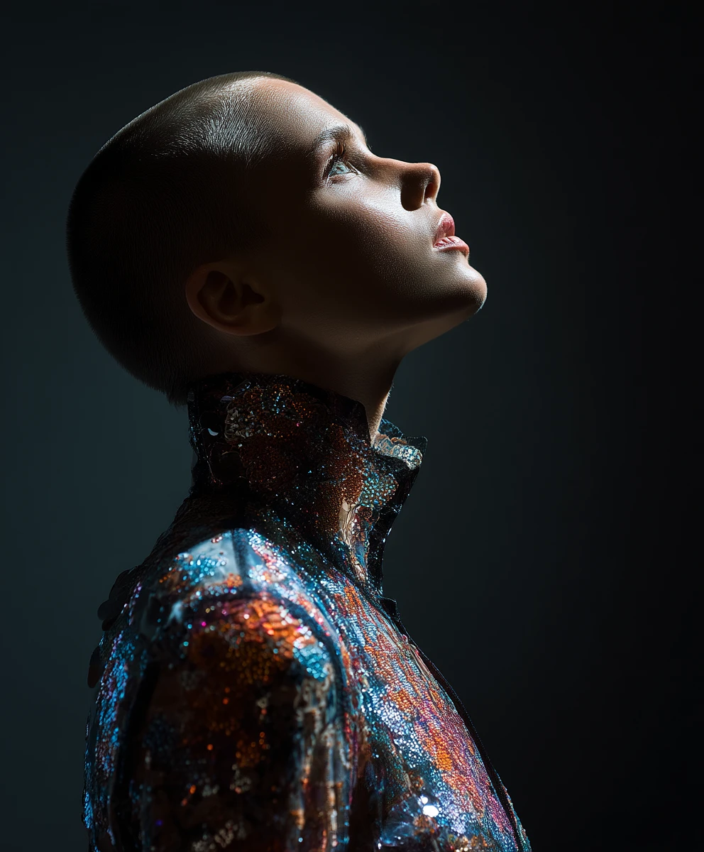 cinematic minimalism, a lone alien model showcasing minimalist fashion, runway in space, simple patterns, bright accents, fashion cinematography, shot on hasselblad h6d, macro lens, medium format, full body, modelvoid contrast, simple, radiant, cosmic runway, focused spotlight, zero gravity, vibrant palette, centered, elegance, depth of field, soft focus, vignette, annie leibovitz style, minimalism, fashion surrealism
