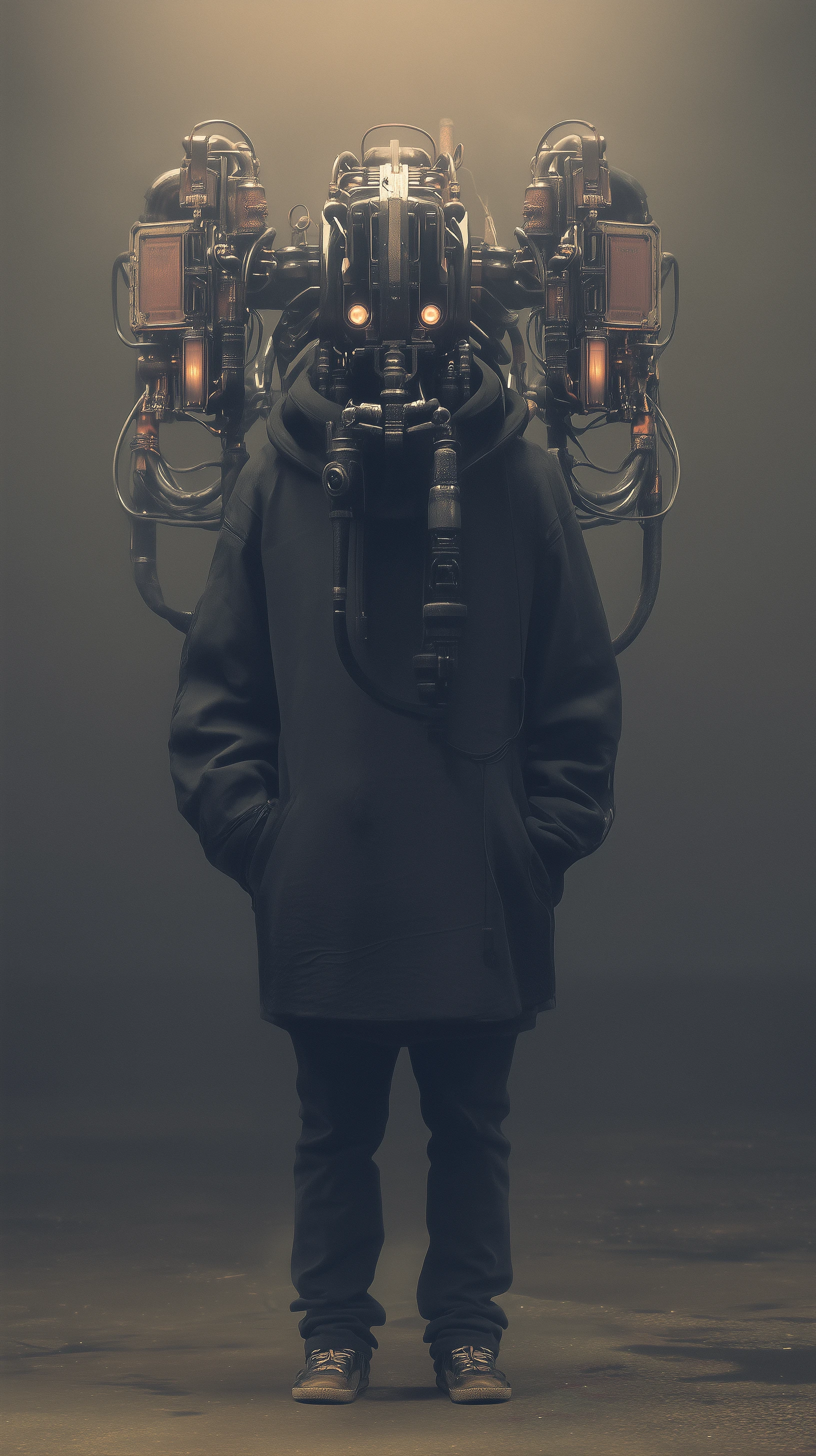 photorealistic, full-body, horroristic figure, front view, nihilism, intricate mechanical, muted futuristic minimalist style, moody background, low-key, deep fog, rich detail --ar 9:16 --v 7