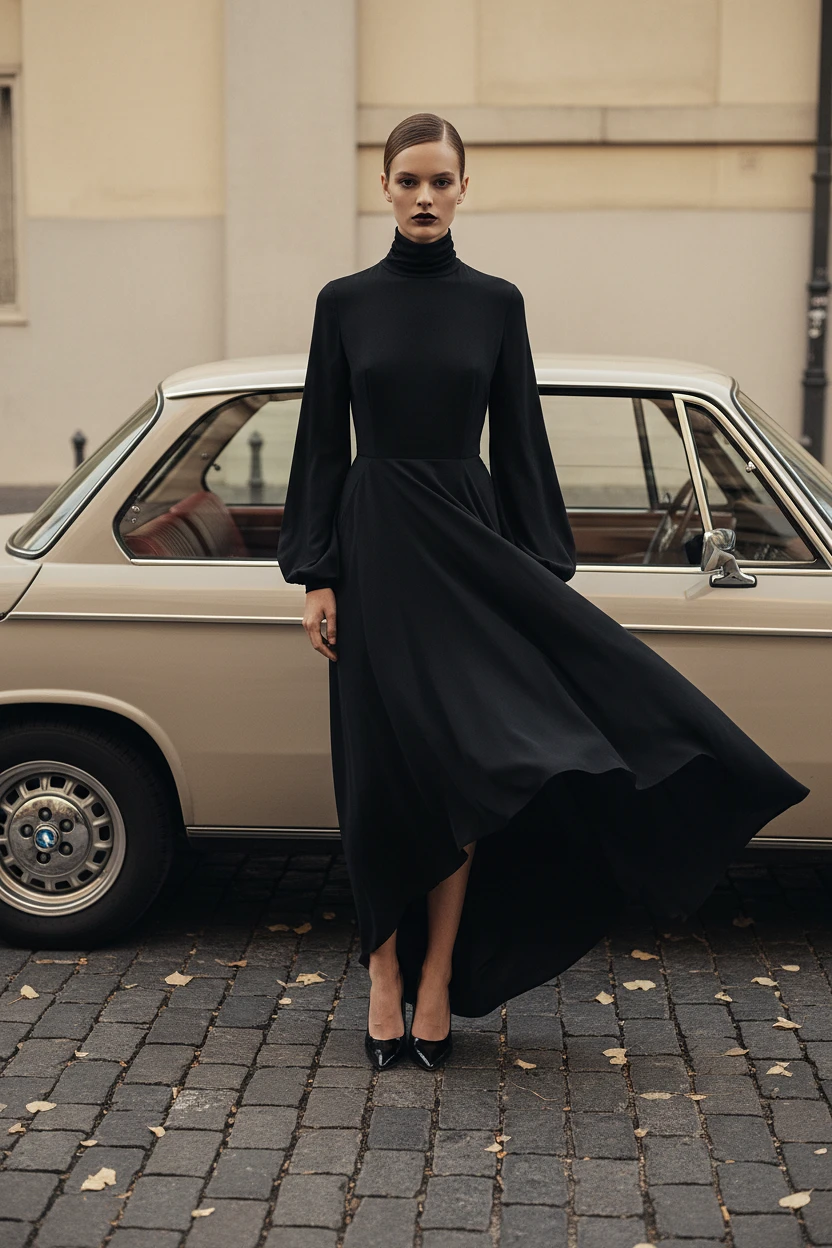 High-fashion editorial photography, a tall model standing confidently in front of a vintage BMW car with neutral tones. The model wears a flowing, asymmetrical black dress with a high-neck turtleneck, elegant and modern, paired with black pointed heels. Subtle windswept effect on the fabric, soft natural light, muted and slightly desaturated tones, sophisticated and avant-garde aesthetic. The car features retro-style rims, and its interior has a reddish-brown tone visible.