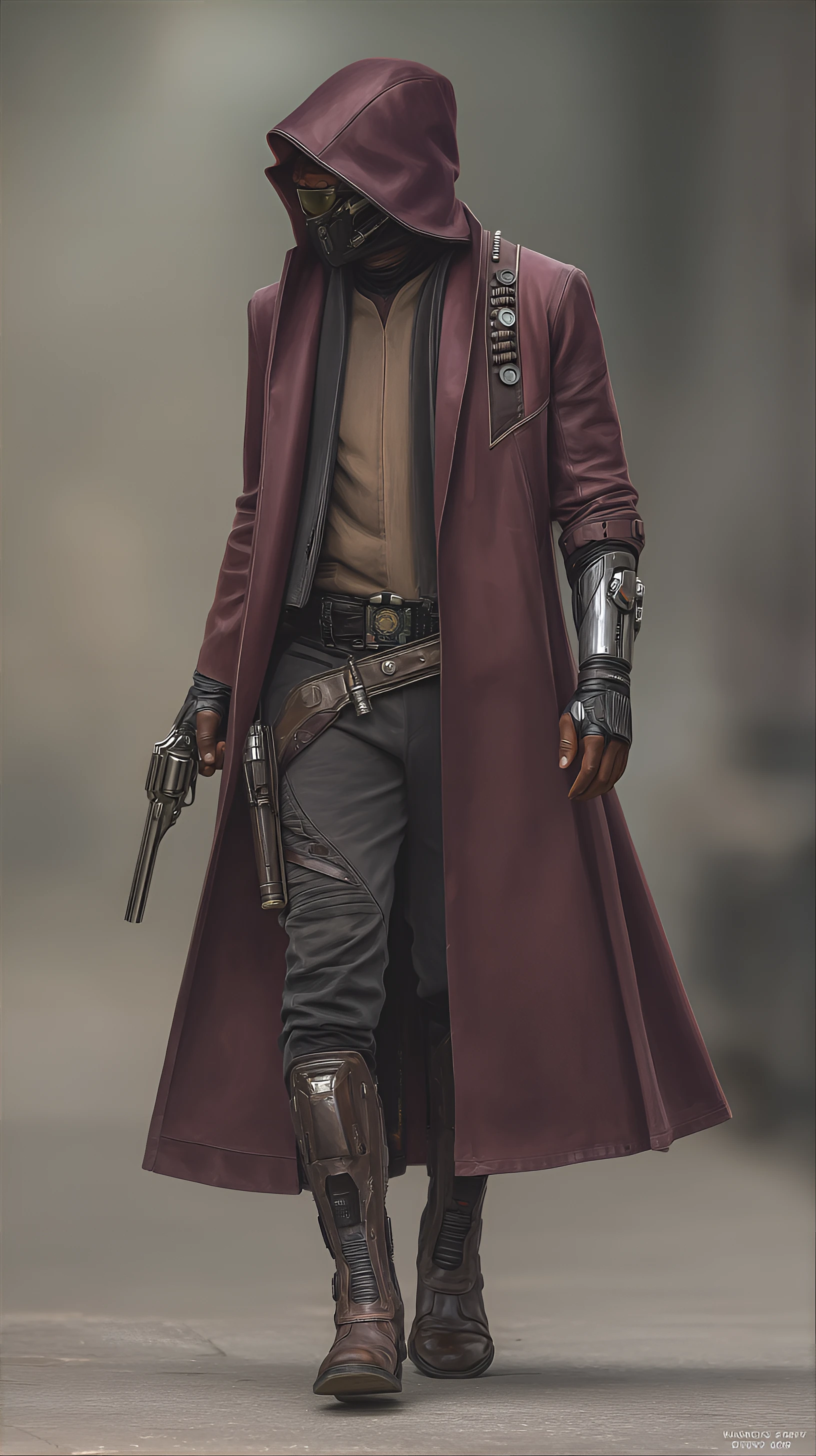 young adult, light-skinned male, with a serious expression, walks down a city street. He wears a long, deep maroon coat, a style reminiscent of a classic Western duster, but with futuristic details. The coat is made of a smooth, supple material, likely synthetic leather or a similar high-tech fabric, featuring subtle metallic accents. He wears a muted, tan colored, fitted shirt underneath the coat, and dark, brownish-gray, stylish trousers. The pants have accents of metal plating and armor-like details along the legs. He has a metallic arm prosthesis, styled similarly to the leg armor, with intricate details. He wears boots that are dark brown/gray with metal accents and a slight heel.
