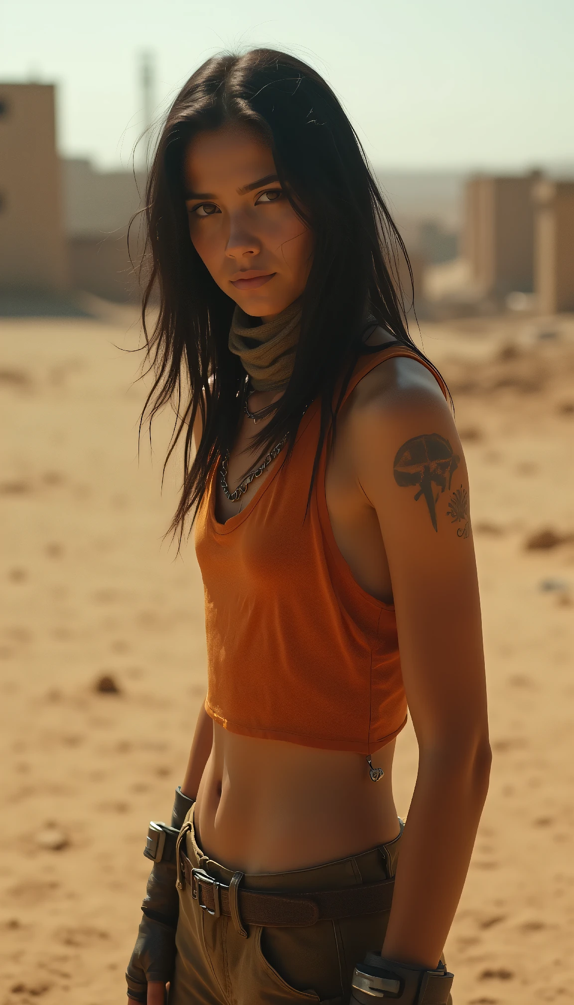 dystopian style Close-up half body shot (from a drone flying High Angle from the right above the subject:1.5) of a 24-year-old woman with long black messy hair standing in a dystopian desert, looking directly into the camera of the drone. Her hands in fingerless gloves with metal knuckles, clenched into fists, she stands tensly in a defencive position. Thin, fit and muscular physique like someone who fights daily for survival, she stands dressed in a sleeveless orange/reddish top which displays her flat toned belly, visible abs. A kufiya wrapped around her neck, worn utility pants and worn brown leather boots Armed for survival with a utility belt with pouches containing survival tools, Several throwing knives visible in ankle sheaths. Her arms are covered with tattos an in one shoulder a huge bloody scar. far in the Background a post-apocalyptic deserted urban environment. Her alert posture and scanning gaze suggest constant vigilance, muscles tensed ready for action. Harsh lighting creating shadows that accentuate her muscular definition, desaturated color palette with occasional rust tones, cinematic composition, hyperrealistic details, 8k quality . bleak, post-apocalyptic, somber, dramatic, highly detailed