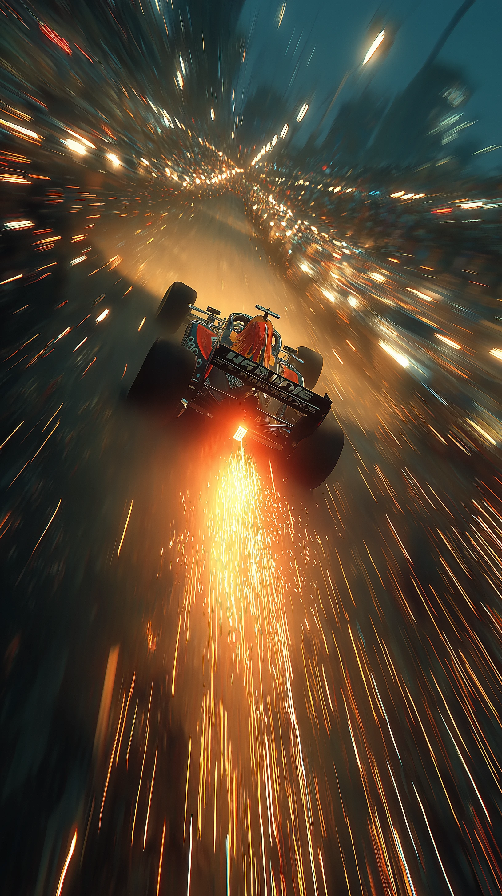 cinematic, overhead whip-pan capturing F1 machine, full-shot, burst past, night, motion blur, tail light, dust particles kicked into glowing stripes, high-energy composition, realistic, detailed --ar 9:16 --raw --stylize 500 --v 7
