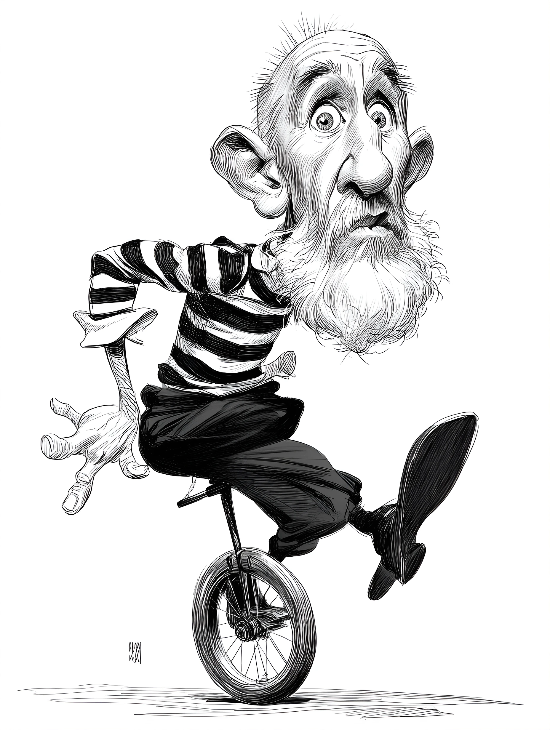 funny caricature, acrobatic mime caricature, middle-aged caucasian male, 50 years old, slim build, long white beard, expressive eyes, big cartoonish head, exaggerated caricature features, playful expression, wearing black and white striped shirt, black pants, black shoes, balancing on wheel pose, sketch caricature style with ink outlines, clear lines, minimalistic details, whimsical, playful, satirical, captivatingly quirky, street performer environment