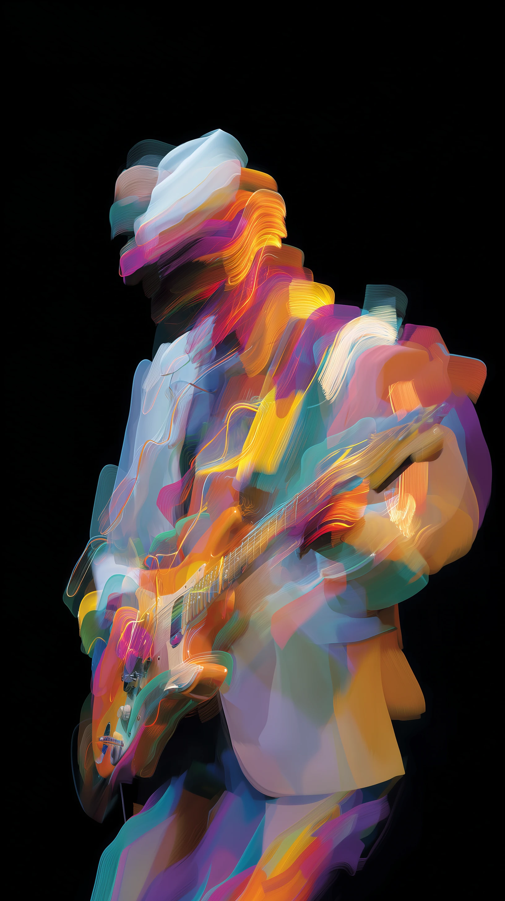 realistic, front shot, guitarist in motion, neon color trails, chrono-burst time-slice exposure, layered motion, black background --ar 9:16 --raw --profile otwluoo --stylize 300