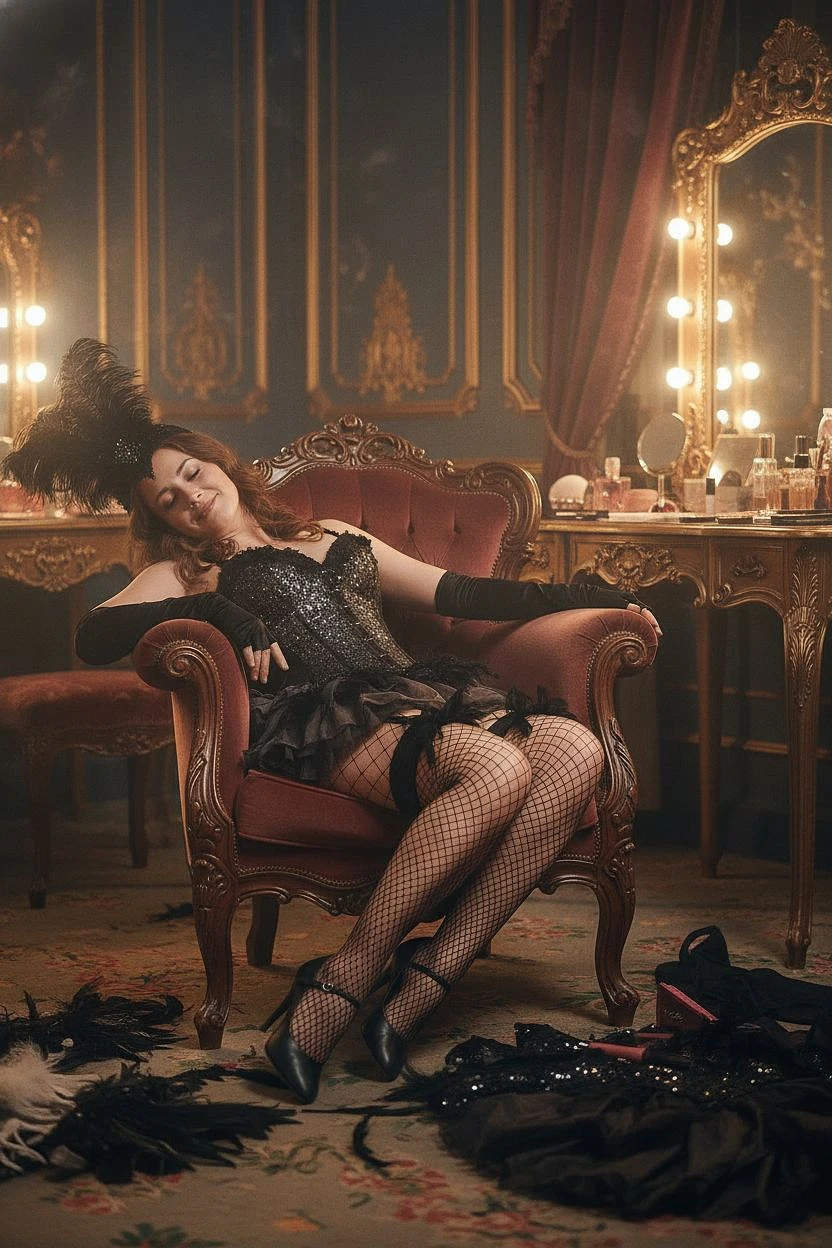 full body image of the the uploaded woman as a temptress in style of a vaudeville burlesque dancer with feathers, stockings. She is flopped on an ornate chair in the dressing room, exhausted but content. opulent architecture. hyper-realistic, photorealistic with no cartoon, anime, CGI, or painted effect. Cinematic frame in 2.39:1. Shot with a 50mm lens, shallow depth of field, soft bokeh. Lighting is warm. Color grading with soft tones, desaturated background, dreamy glow using a Pro-Mist effect.