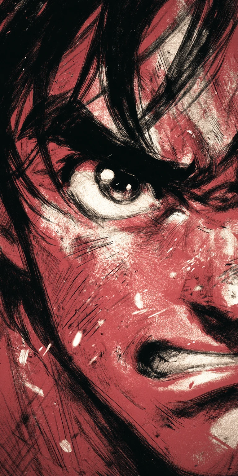 manga panel intense, against a dark red background, in the style of Kentaro Miura and Yoji Shinkawa --chaos 75 --ar 1:2 --profile fkuo5yb --stylize 750 --v 7