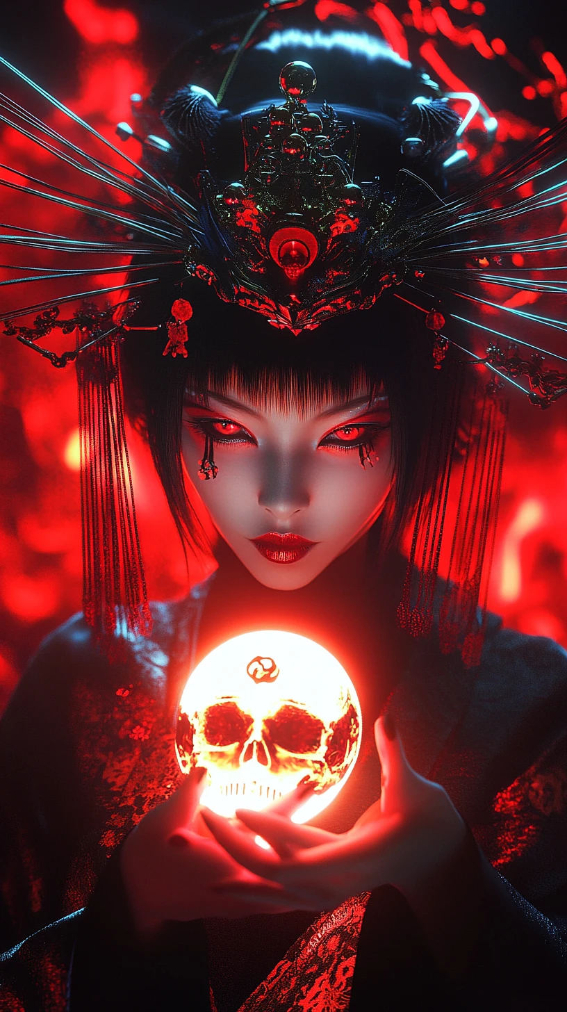 3D rendering, face close-up, CG high model, Enigmatic [goth cyberpunk geisha queen] wearing luminous headgear and holding a glowing skull orb, in a [red and black] color scheme, dark fantasy, anime-style, surrounded by swirling neon smoke. --ar 9:16