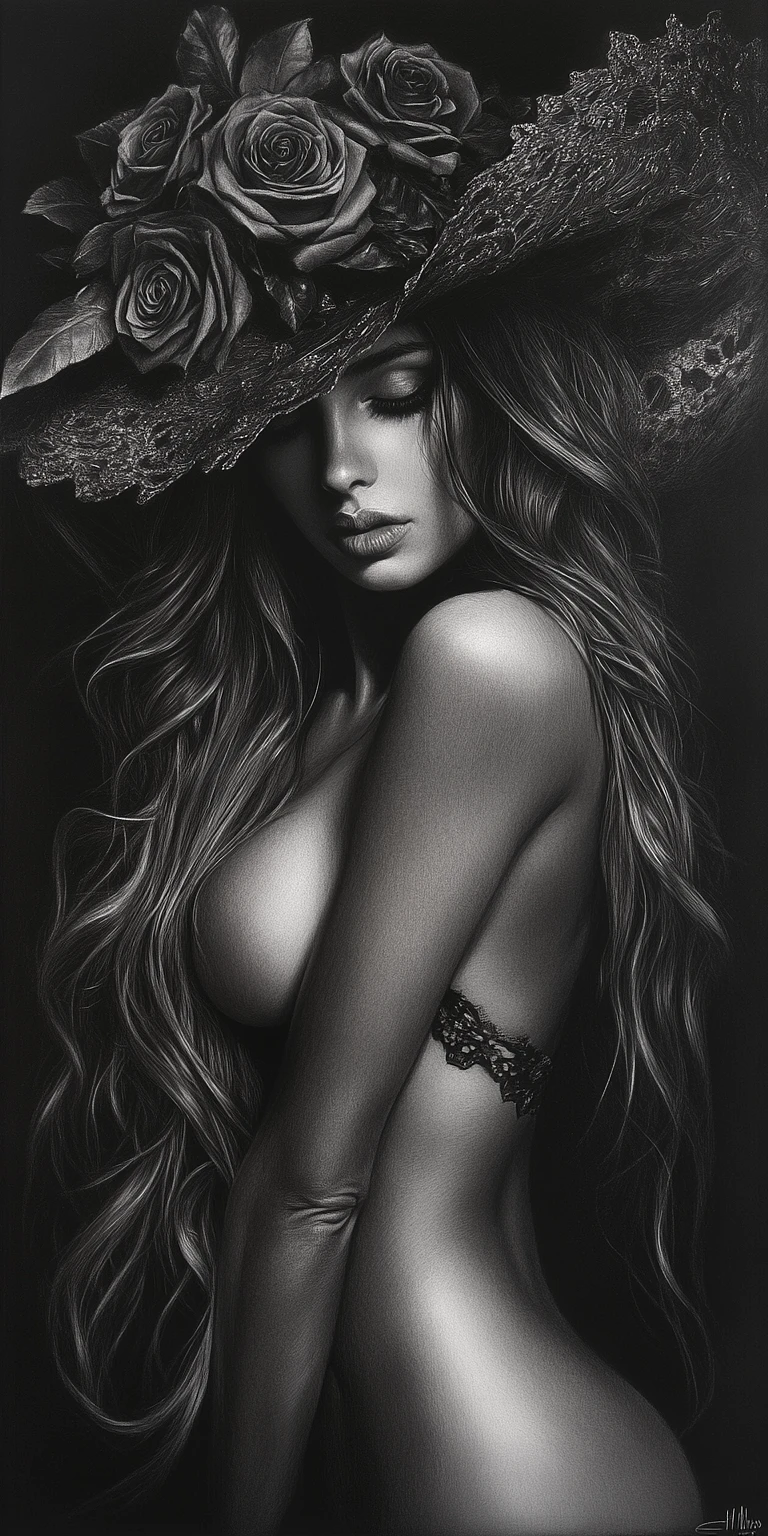 A captivating portrait of a woman with long, flowing hair cascading down her shoulders. She wears a large, intricately designed hat adorned with dark roses, creating a striking contrast against her fair skin. The lighting highlights her profile, revealing delicate facial features and softly parted lips. A black lace band encircles her torso, adding an element of elegance and allure. The backdrop is a deep black, enhancing the overall monochromatic scheme and focusing attention on her graceful figure. The artwork exudes a sense of mystery and sophistication, blending beauty with a touch of darkness.