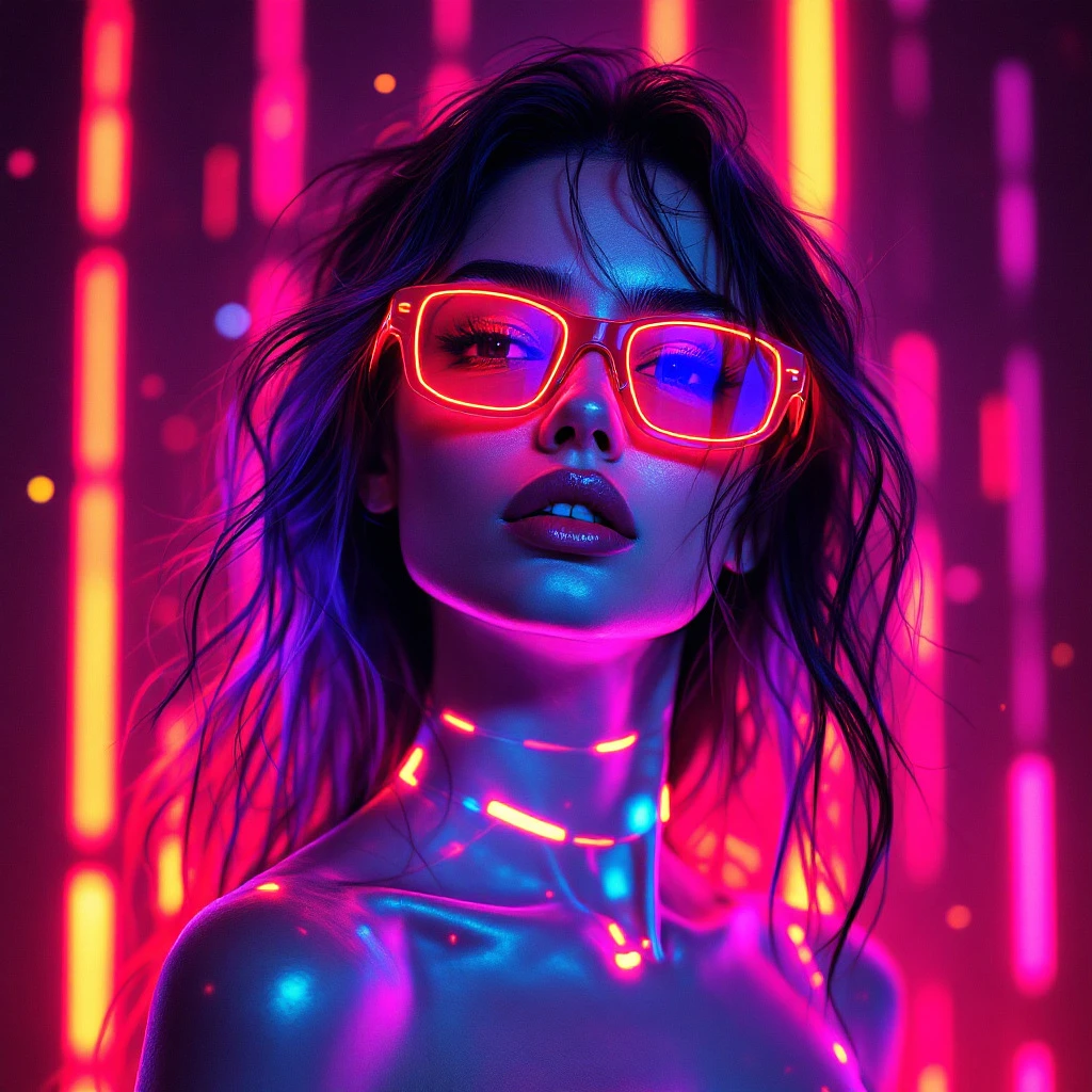 a full body bio limerent woman looking at viewer, Futuristic retro vaporwave,wonder women, (futuristic) , (masterpiece) , (realistic) , (perfect anatomy) , (Full body viewing from head to feet), neon woman with long messy wavy hair, wears red sunglasses, lights densely packed, mimicking the contours and features of a woman's body, bio-luminescent, translucent, cinematic, Film light, surreal hallucinatory intricately detailed, fairy lights, captures viewers with beauty and mesmerism, Hyper detailed, Hyper realistic, masterpiece, atmospheric, High resolution, Vibrant, CLEAR CRIMSON/AMBER/Cyan/purple, light particles, colorful, backlit, cyberpunk. The whole composition should feel vibrant, chaotic, and energetic, perfect for a t-shirt or poster with a neo-vintage comic and psychedelic urban aesthetic. ((best quality master piece. deep lines, heavy strokes,) ) Her expressive, charming eyes and soft, delicate facial features arouse admiration, creating a welcoming and adorable presence. The epic scene with lens glow lighting in a modern futuristic grand setting depicts an intricate with volumetric lighting. (highest quality face) , (highest quality clothes) , (best shadow) high-resolution photography, ultra-realistic --ar 2:3 --stylize 750 --v 6. 1