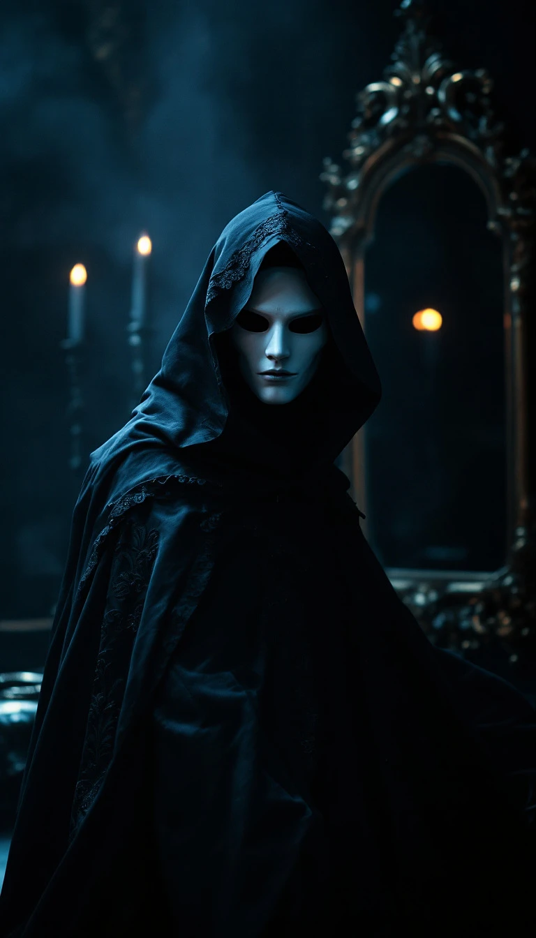 Dramatic portrait of a masked mystic in a shadowy baroque chamber, wearing an intricate dark cape, pale mask with sharp features, single candle casting dramatic shadows, ornate gilded mirror reflecting mysterious atmosphere, deep blue-black color scheme, cinematic chiaroscuro lighting, Gothic Renaissance aesthetic, ethereal and enigmatic composition, hyperdetailed, photorealistic render