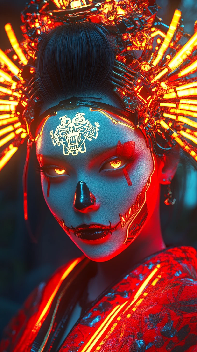 3D rendering, face close-up, CG high model, Elegant [goth geisha] with neon glowing makeup and a holographic skull headdress, in a [red and gold] cyberpunk aesthetic, dark fantasy, anime-style, illuminated by soft neon lighting. --ar 9:16 --v 6.1