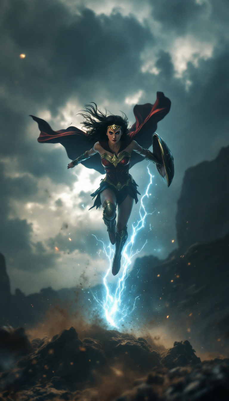 Epic slow-motion scene of a young female superhero inspired by Wonder Woman leaping from a cliff into a stormy battlefield. Dark clouds swirl above, lit by dramatic flashes of lightning. The camera follows her from below as she soars through the sky, her cape flowing and armor gleaming. Her shield is locked to her arm, and her eyes glow with intensity. Upon landing, she creates a shockwave that cracks the earth, sending dust and energy outward. The enemy forces recoil in fear. The environment is cinematic, stormy, and full of dramatic lighting. Ultra-realistic visuals with high-quality animation.