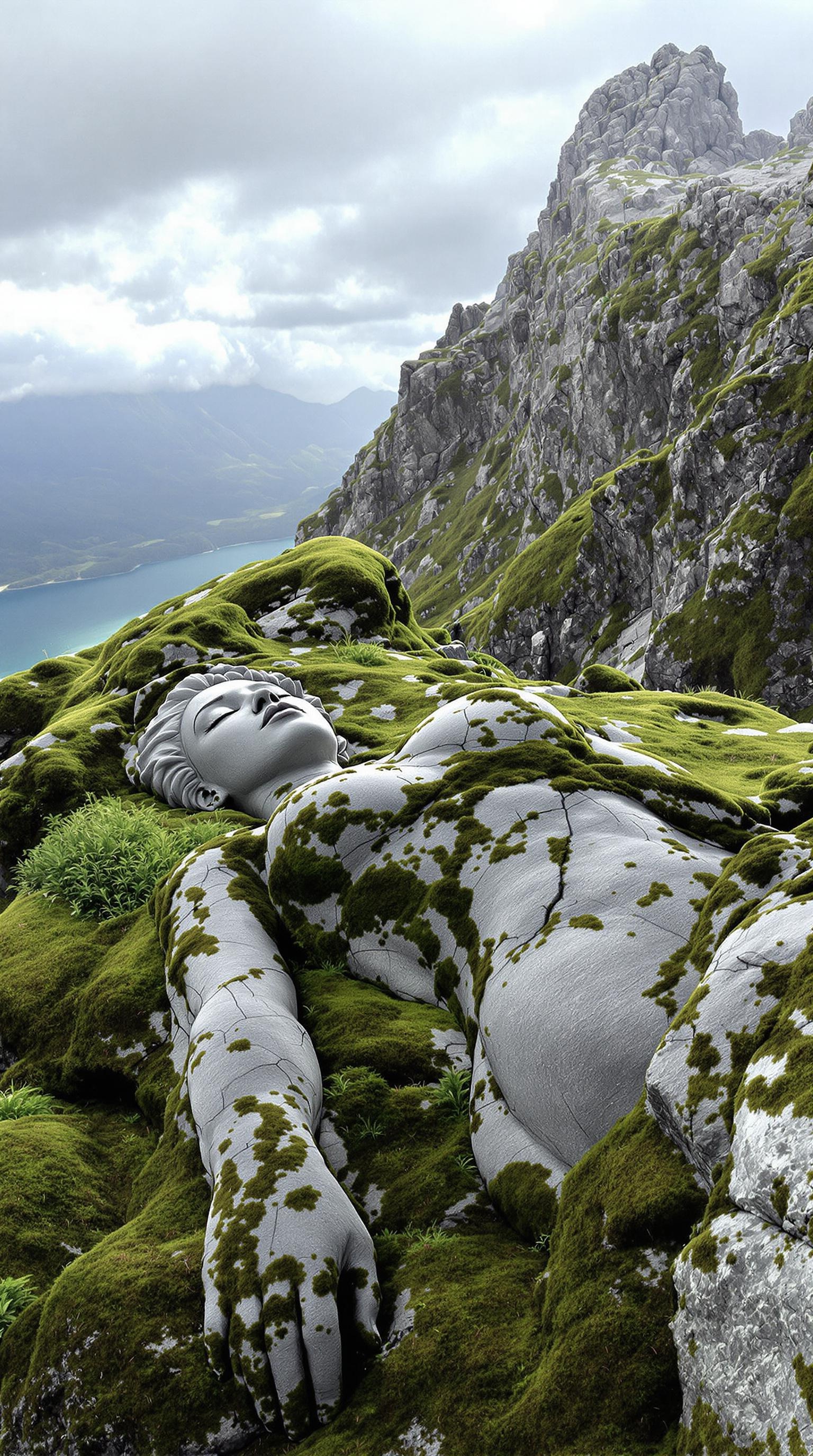 The surrounding landscape is rugged and mountainous, with a body of water visible in the distance. The scene is rendered in a realistic style with a focus on detail and texture, conveying a mood of tranquility and timelessness.