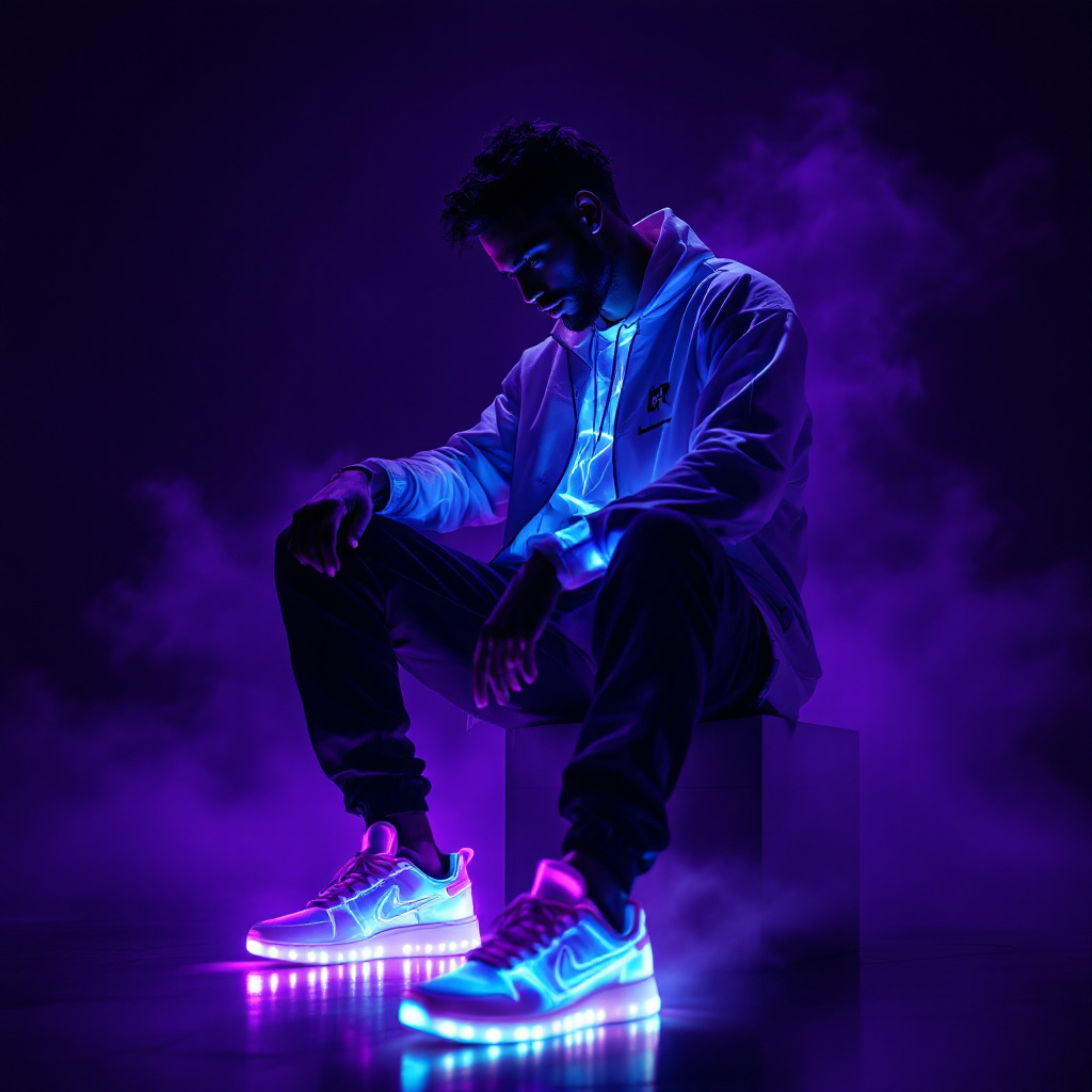 fashion photography, professional man model, shot with Canon eos r3, 50mm f/1.2 rf lens, f/2.8 settings, 1/160s, iso 1600, gradient neon violet, streetwear style, holographic effect on wear, luminescent sneaker soles, dark backdrop with deep purple atmospheric lighting, professional studio setup with two led strip lights at floor level and one overhead softbox at 5600k, cyberpunk aesthetic, side profile pose with silhouette, dramatic contrast, ultra sharp details, photorealistic quality, 48K resolution, rich detailing --chaos 16 --ar 9:16 --style raw --personalize c84qxg1 --stylize 300 --v 6.1