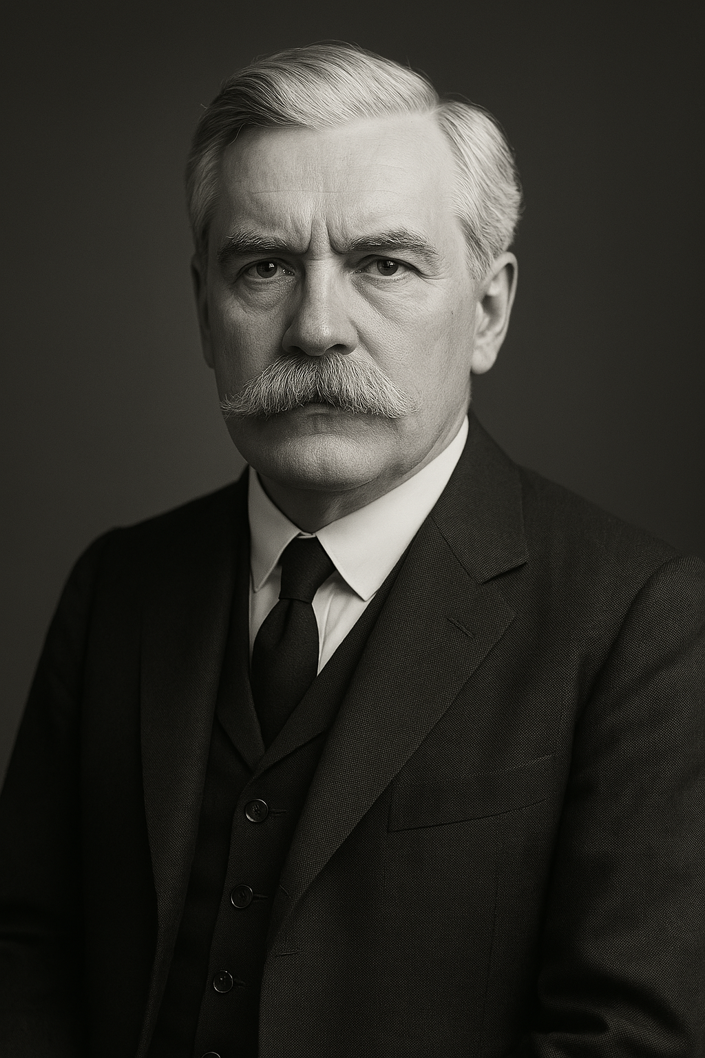 Clothing: Dressed in a dark, formal suit jacket, likely made of wool or a similar textured fabric. Beneath the jacket, a light-colored collared shirt is visible, with a dark, perhaps patterned, necktie fastened with a decorative tie pin or clasp. A dark waistcoat might be partially visible under the jacket.Background: A plain, solid-colored backdrop, likely a medium gray or dark neutral tone. It is uniformly lit and appears smooth, without any patterns, objects, or discernible features, ensuring the subject is the sole focus.