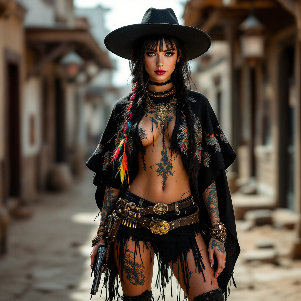 Full body photo HD beautiful Mexican girl standing in the old west streets of tombstone, wearing a black Stetson with brim just above eyebrow level, black Mexican designed poncho pulled down, decorative black vest open in the middle, ragged and torn black mini skirt, gold choker and gun belt with bullets, old western pistol in the holster, black western boots, Colorful dragon style tattoos covering entire her body. Sparkling dark blue eyes, long black hair and bangs with hair in a single braid hanging in the front with colorful feathers at the end of the braid. She is in a gunfighter stance ready to draw on her challenger.