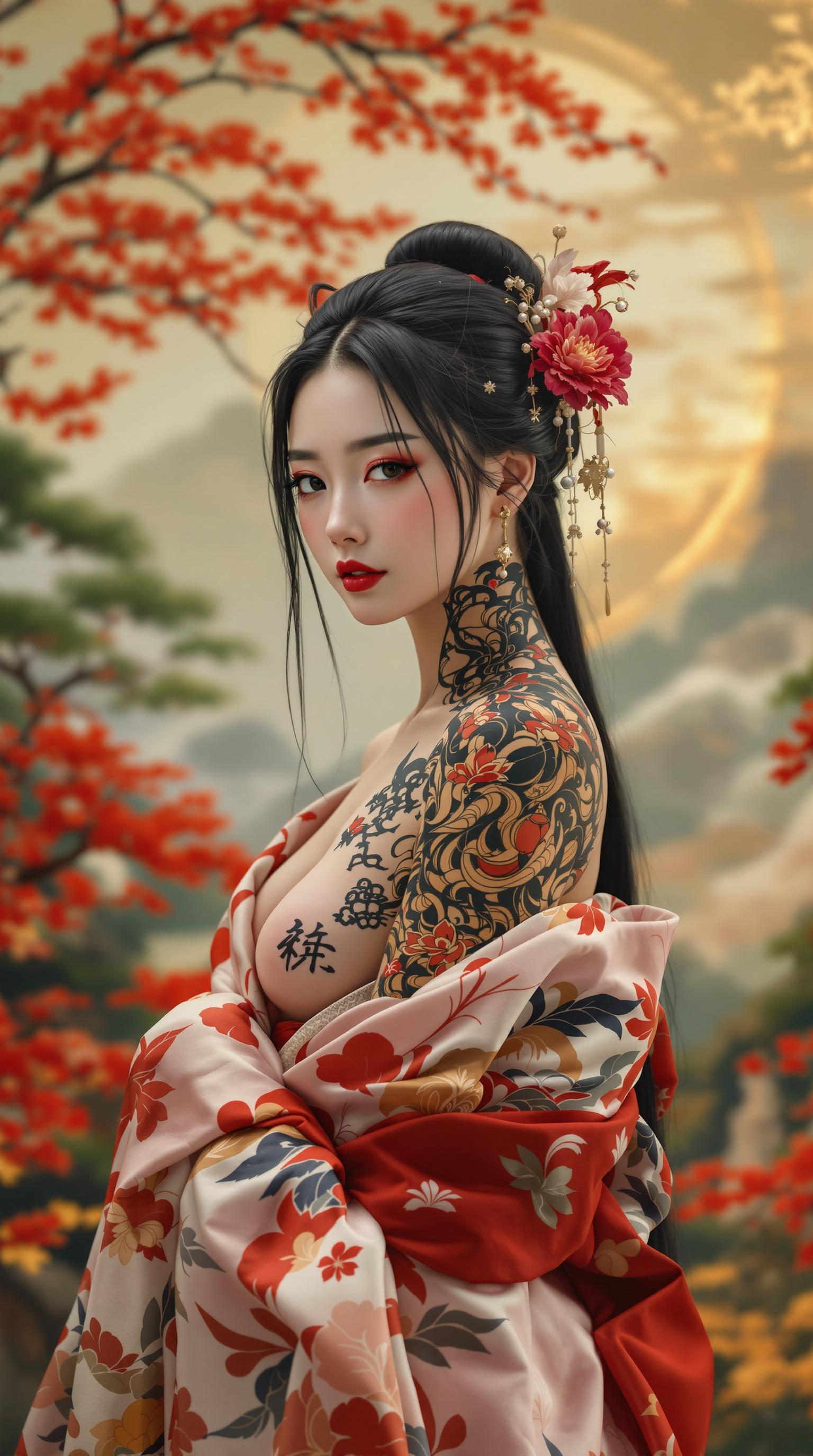 ue de dos, une femme japonaise avec un grand tatooage de grue colorée traditionel, femme japonaise dos denudé avec tatouage atistique traditionnel japonais, portrait artistique de femme, taille fine, cheveux longs, expression pensive, peau porcelaine, kimono sans motifs rouge couvre le reste du corps, fond de paysage japonais traditionnel, lumière douce, couleurs chaudes, photographie artistique, 8K, HDR, ultra-détaillé, rendu photorealiste, pinceau d'huile, effets de lumière naturelle